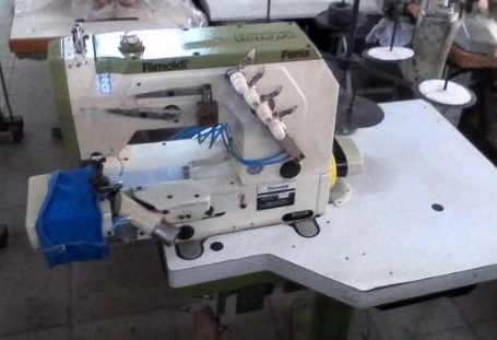 Máquina Neumática para poner goma de base reducida marca Rimoldi modelo 271 FS 3MDAC, con 3 agujas con cuchilla de recorte, automática con corta-hilos. Completa con bancada y motor