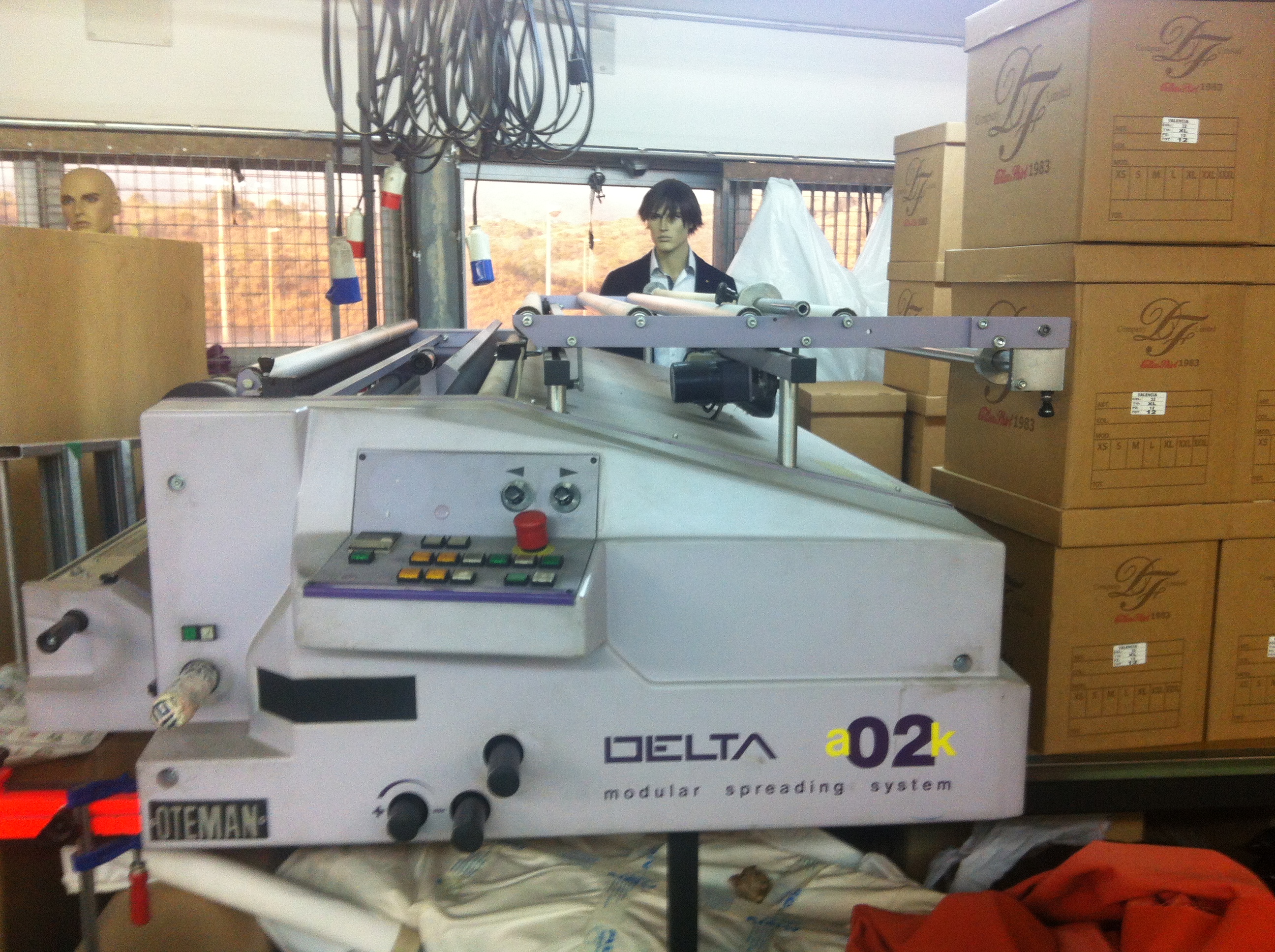 OTEMAN modelo DELTA A02K automática, sistema de barra, para todo tipo de tejidos en punto y a la plana con programación de capas, orillado por fotocélula, alzador automático, alimentación automática, velocidad regulable, detector de altura de extendido. Ancho útil 1’80 Mts. 1-Plegador de corte automático hoja a hoja con regulador de velocidad al corte y retorno rápido. 10 metros de mesa de corte modular con estructura metálica y tableros y pinzas para el zig-zag.