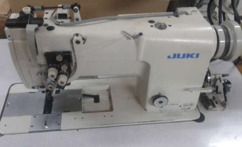 Máquina marca Juki Modelo LH-1182-6 con 2 agujas de doble arrastre con aguja desembragable, canilla grande, corta-hílos, atacados y alzapata.